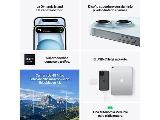 Apple iPhone 15, Azul, 128 GB, 5G, 6.1″ OLED Super Retina XDR, Chip A16 Bionic, iOS