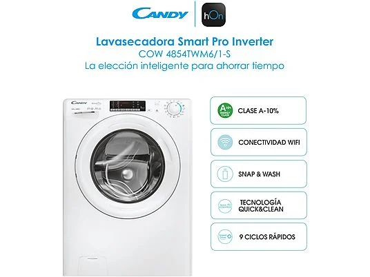 Sé el primero en valorar “Lavadora secadora – Candy Smart Pro Inverter COW 4854TWM6/1-S, 8 kg/5 kg, 1400 rpm, 16 programas, Wi-Fi, A-10% en Lavado, Blanco”