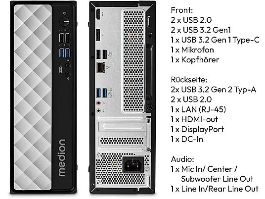 Front : •2x USB 2.0 Typ-A •2x USB 3.2 Gen 1 Typ-A •1x Typ-C USB 3.2 Gen 1 (5Gbps) •1x Microphone-In •1x Audio Line-out; Rear : •2x USB 3.2 Gen 2 Typ-A •2x USB 2.0 Typ-A •1x HDMI •1x DP 1.4 •1x RJ45 Gigabit LAN •1x Microphone-In •1x Audio Line-out |