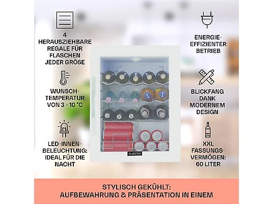 1 x nevera para bebidas, 1 x estante, 2 x botellero (en forma de onda), 1 x estantería de champán, Manual de instrucciones en varios idiomas, |