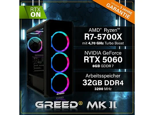 PC Gaming – GREED MK2 AMD | Gaming Ordenador / Computer, AMD Ryzen 7 5700X, 32 GB RAM, 1000 GB SSD, GeForce RTX™ 5060, Windows 11 Pro, Negro