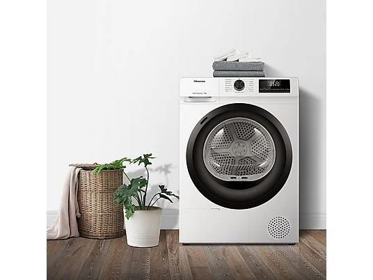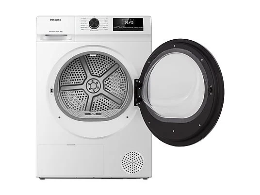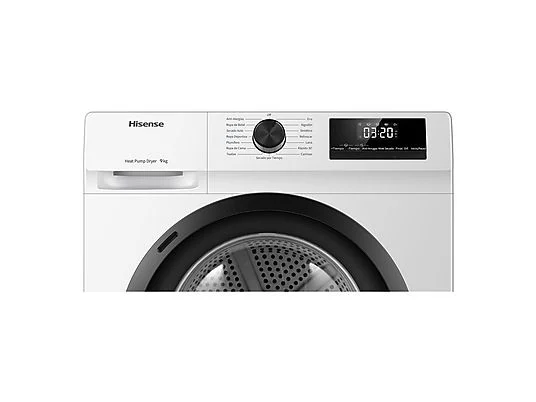 Secadora bomba de calor – Hisense DHQE900UWDC, 9 kg, 16 programas, Anti arrugas, Secado automático, Blanco.