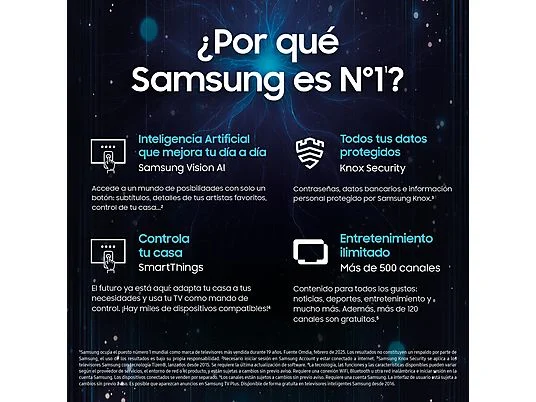 OTS Lite, Q-Symphony, Tipo de altavoz 2CH, Adaptive Sound Pro, Gaming Hub, Multi Device Experience, Multi-View, Apple AirPlay, Daily+, Storage Share, Click to Search, Generative Wallpaper, Karaoke Mic |